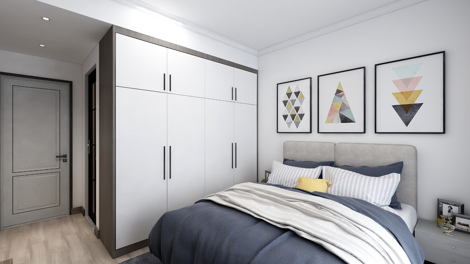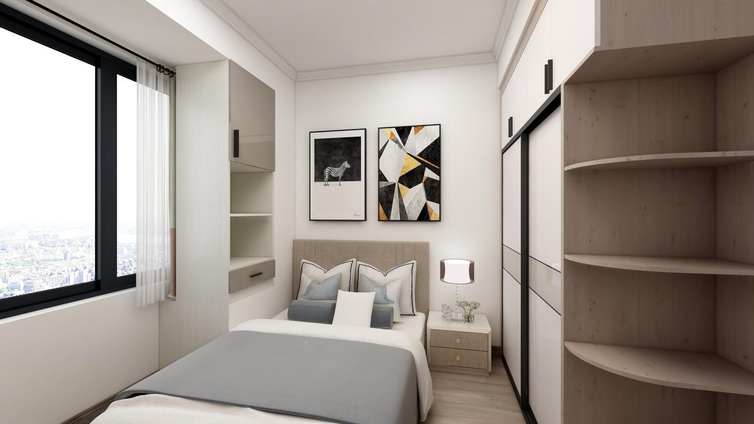 主臥室采用大面積留白,與裝飾掛畫(huà)結(jié)合,打破白色墻壁的呆板,營(yíng)造出空間的層次關(guān)系。